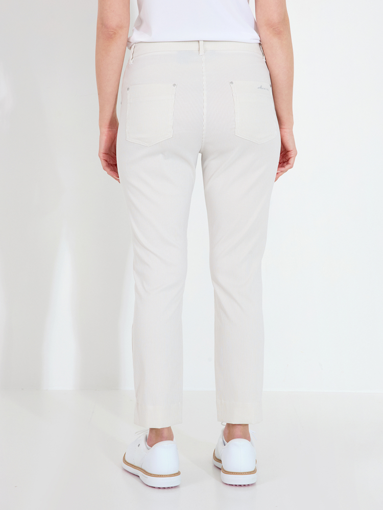 Dessa byxor med sitt klassiska smalrandiga mönster kommer att få dig att känna dig bekväm och se bra ut på golfbanan, samtidigt som du också kommer att ha ett par perfekta vår- och sommarbyxor. Bovey-byxorna ser ut som ett par jeans, men är mycket töjbara för att du ska kunna uppleva hela rörelseomfånget på golfbanan. Drycool- och andningsfunktionerna transporterar bort fukt för att hjälpa dig att känna dig sval även under varmare dagar. Med två fickor fram, två bakfickor och dragkedja fram gylf med tryckknapp i midjan. Bälteshällor runt midjan.