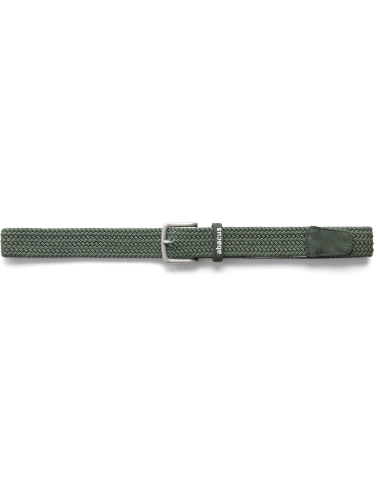 Det snygga gröna Moray-bältet är flätat och har därför en elastisk konstruktion. Detta gör det också möjligt att justera bältet för perfekt passform. Detaljer i kanvas, klassiskt spänne i matt silver. Abacus-logotyp bredvid spännet.