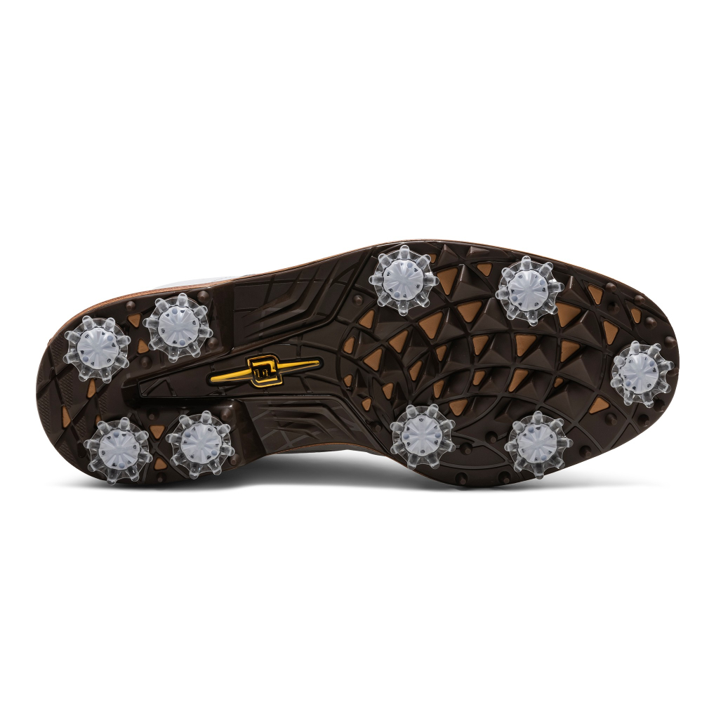 För maximal komfort under hela rundan är skon utrustad med en Premiere EVA-mellansula som levererar fast, prestationsinriktad dämpning, samt OrthoLite® EcoPlush FitBed® som ger stöd och komfort under foten. OrthoLite® TruFit-tungsystem, tillsammans med extra vaddering runt hälen och mjuka läderfoder, säkerställer en säker och konturerad passform. Den högpresterande ARCTrax-yttersulan med förnybara Pulsar LP-spikar från SoftSpikes® ger pålitligt grepp på alla underlag, vilket gör att du kan svinga med självförtroende i alla lägen.