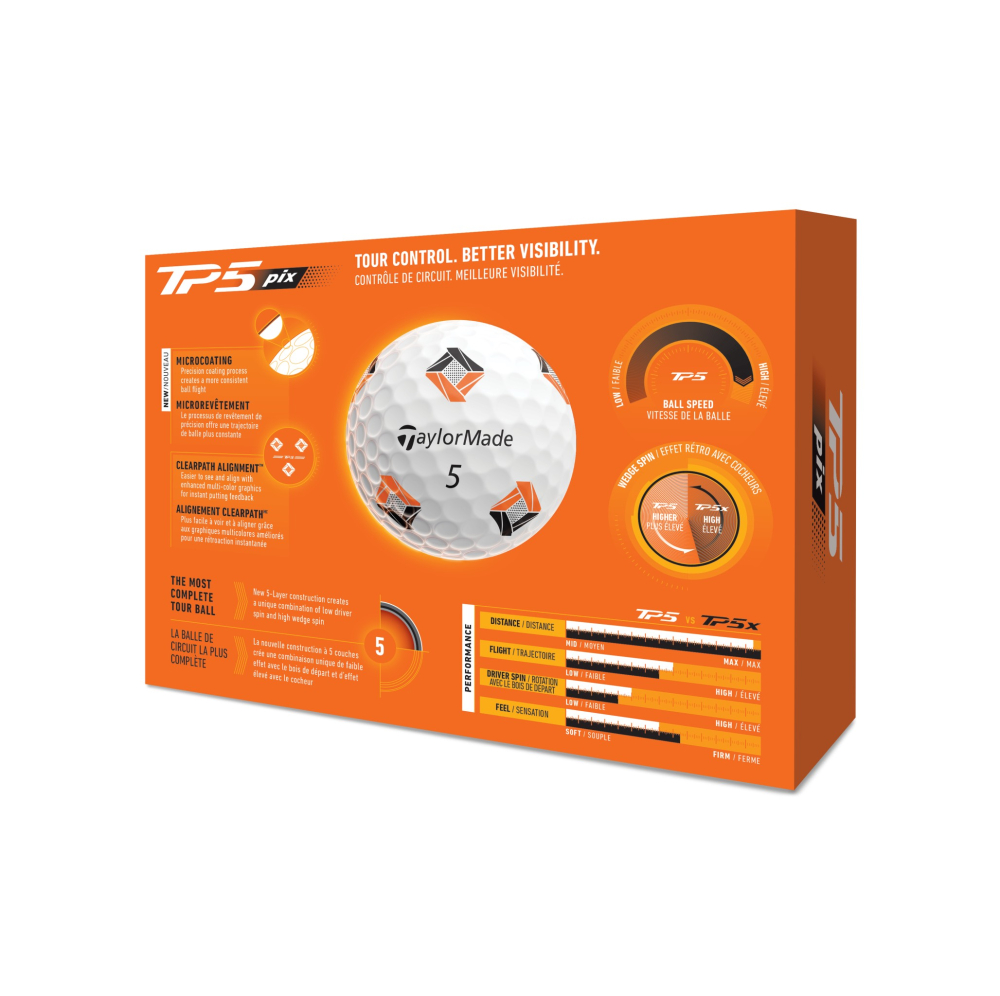 Nya TP5-bollen har fått flera förbättringar som ger bättre längd och rakare slag. Den nya 5-lagerskonstruktionen har Taylormades hittills största kärna minskar kontakttiden med träffytan, vilket resulterar i mer energiretention och snabbare bollhastigheter på slag med hög svinghastighet. Det nya tunnare mantellagret med nya materialkompositioner förfinar bollhastigheten och finjusterar spinn under hela bollbanan. Det tunnare och mer hållbart gjutna uretanskalet tillsammans med det hårdaste yttre mantellagret ser till att ge högt spinn in mot och runt greenerna med de kortare järnen samt lägre spinn med driver och de långa klubborna för längre slag.