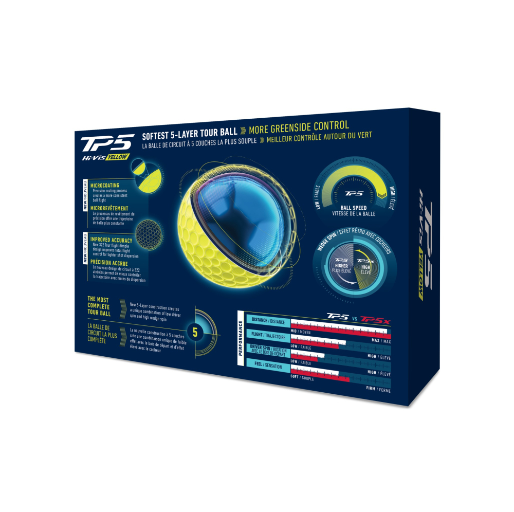Nya TP5-bollen har fått flera förbättringar som ger bättre längd och rakare slag. Den nya 5-lagerskonstruktionen har Taylormades hittills största kärna minskar kontakttiden med träffytan, vilket resulterar i mer energiretention och snabbare bollhastigheter på slag med hög svinghastighet. Det nya tunnare mantellagret med nya materialkompositioner förfinar bollhastigheten och finjusterar spinn under hela bollbanan. Det tunnare och mer hållbart gjutna uretanskalet tillsammans med det hårdaste yttre mantellagret ser till att ge högt spinn in mot och runt greenerna med de kortare järnen samt lägre spinn med driver och de långa klubborna för längre slag.