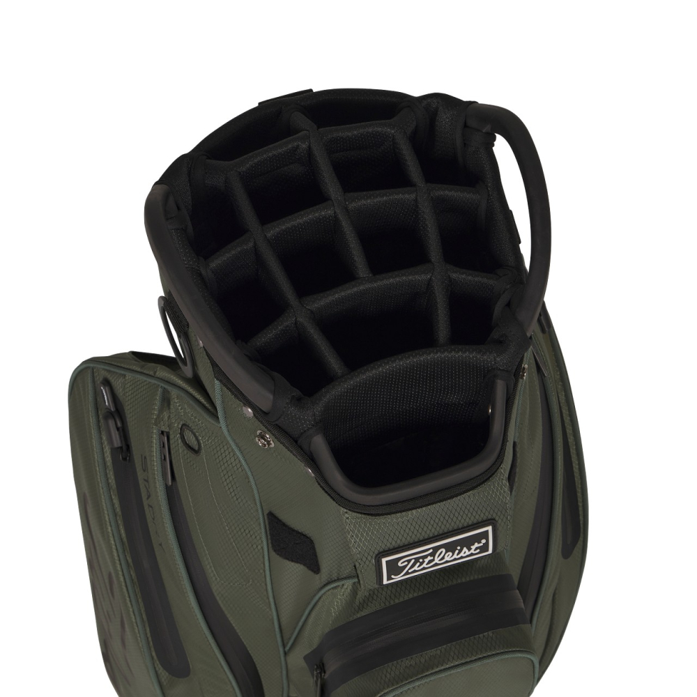 Här får du en vattentät vagnbag med en 14-delad topp inklusive ett separat putterfack. Den helt nya symmetriska designen har tagits fram för att ge dig optimal ording på dina saker i fickorna på båda sidorna samt att de ska vara låttåtkomliga. Totalt har du 7 st fickor varav en stor ficka för dryck. I toppen har du mjuka och tourinspirerande samt integrerande handtag för att göra det lätt och enkelt för dig att lyfta bagen.